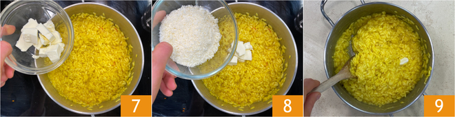 Após o tempo de cozimento do arroz, desligue o fogo e finalize com a manteiga fria 7 e o queijo ralado 8. Misture tudo 9 e deixe o risoto descansar por alguns minutos antes de servir.