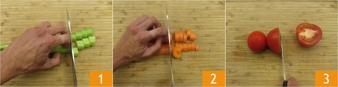 Para preparar o Risoto ao Champagne e camarões, comece pelos legumes para o caldo, corte grosseiramente o aipo 1, a cenoura com toda a casca, os tomates 3 e os alhos-porós.