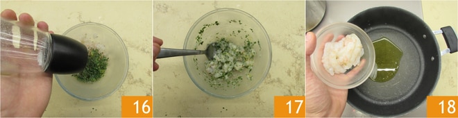 sal e pimenta 16, misture e reserve para misturar ao arroz 17. Em uma panela onde você também cozinhará o arroz, aqueça bem um fio de azeite e doure os camarões deixados inteiros 18.