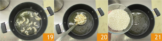 Doure-os por cerca de 5 minutos sem virá-los 19. Retire os camarões 20 e na mesma panela comece a torrar o arroz 21 com uma pitada de sal por cerca de 3-4 minutos.
