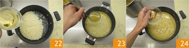 Molhe com o champagne 22, que você usará todo no início, despejando-o em duas vezes e deixando absorver bem. Continue o cozimento por cerca de 15 minutos, molhando com o caldo de camarões 23 conforme necessário. Cerca de 3 minutos antes do final, adicione os camarões dourados 24, reservando alguns para decorar o prato.