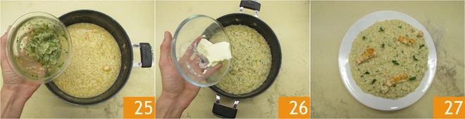 Fora do fogo, adicione os camarões em tartar 25, a manteiga 26 e a pimenta, misture para amalgamar. Sirva o risoto decorando o prato com os camarões dourados restantes e os raminhos de orégano 27.