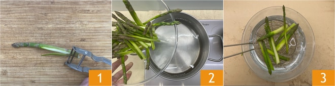 Para preparar o risoto ao creme de aspargos com migalhas de gema, limpe os aspargos: retire a base mais dura e descasque o caule 1, ferva os aspargos por 5 minutos 2, depois escorra e passe-os em água com gelo para manter a cor brilhante e interromper o cozimento 3