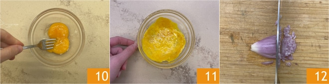 Bata as gemas com sal 10 em uma tigela, cubra com filme plástico e cozinhe por um minuto na potência máxima no micro-ondas, a consistência deve ficar esponjosa 11. Descasque e pique a cebola échalote 12