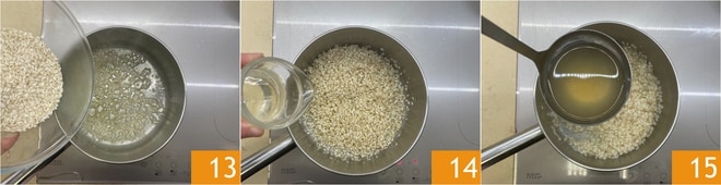 Cozinhe a cebola échalote picada com uma noz de manteiga em uma caçarola, adicione o arroz 13, salgue e toste, adicione o vinho branco 14, deixe evaporar e continue o cozimento com o caldo de legumes 15