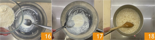 Derreta em banho-maria (mesmo sobre o caldo) o Parmigiano Reggiano DOP com o leite 16, misture para obter um molho liso 17. Quando faltarem 2-3 minutos para o término do cozimento do risoto, adicione o creme de aspargos.