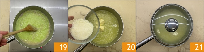Misture 19 e manteque com Parmigiano Reggiano DOP e manteiga 20. Tampe 21 e deixe descansar alguns segundos, depois mexa no formato de onda.