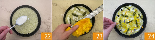Sirva o risoto em um prato raso, decore com a fonduta de Parmigiano Reggiano DOP 22, as pontas dos aspargos, a gema ralada 23 e as flores comestíveis 24.