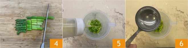 Separe as pontas e reserve-as, corte o restante em pedaços 4, depois coloque em um copo alto com um fio de azeite 5 e uma concha rasa de água do cozimento 6