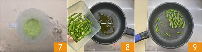 Bata com o mixer de mão até obter um creme homogêneo 7. Aqueça um pouco de azeite na panela, coloque as pontas dos aspargos 8, tempere com sal e pimenta e salteie na panela até dourar 9, devem ficar al dente.
