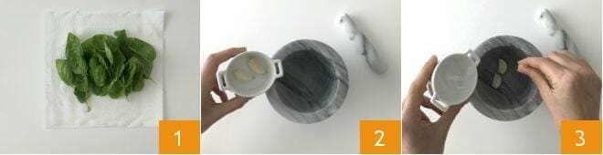 Para preparar o risoto de batata e pesto, faça o pesto: limpe as folhinhas de manjericão com papel toalha 1, coloque dois dentes de alho descascados e sem o miolo dentro do pilão 2, adicione uma pitada de sal 3
