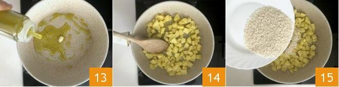 Em uma frigideira, coloque um dente de alho descascado e inteiro, o óleo 13 e doure o dente de alho. Retire o alho e adicione as batatas 14, doure-as por alguns segundos e depois adicione o arroz 15,