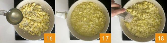 toste rapidamente e despeje o caldo de legumes pouco a pouco 16, cozinhe o risoto 17 polvilhando com pimenta 18, levará cerca de 12 minutos para ficar al dente.