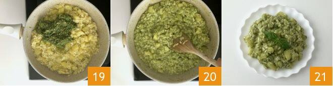 Quando estiver pronto, tempere o arroz com o pesto 19 e misture 20. Sirva o risoto de batata e pesto 21 e aproveite-o bem quente!