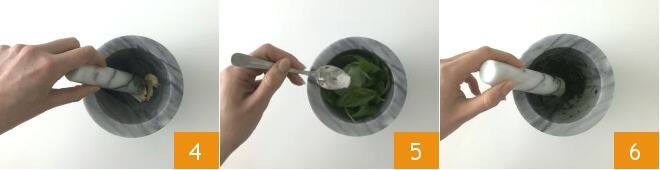 e, com o pilão, amasse bem até que o alho se transforme em creme 4. Em seguida, adicione o manjericão, adicione outra pitada de sal 5 e amasse bem o manjericão contra as paredes do pilão para triturá-lo bem 6.