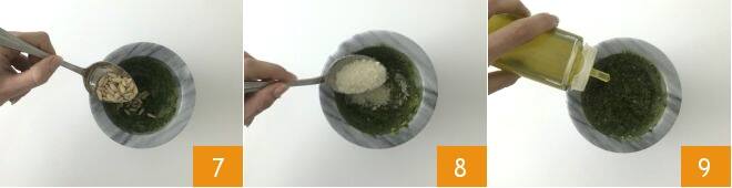 Adicione os pinhões 7, amasse-os e depois adicione o Parmesão ralado 8. Por fim, despeje o óleo 9