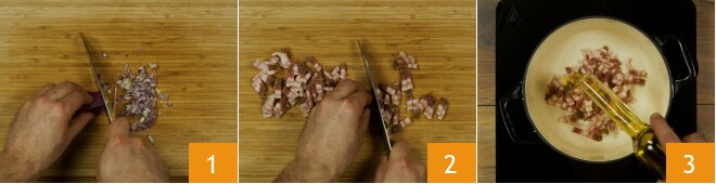 Para preparar o risoto com bacon e creme de ervilhas, comece colocando no fogo a panela com o Caldo de legumes que deverá estar quente para cozinhar o arroz. Continue limpando e picando finamente a cebola 1. Depois, corte o bacon em tiras 2 e vá para o fogão. Em uma panela, coloque o bacon e acrescente um fio de azeite 3.