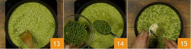 Quando faltarem poucos minutos para o término do cozimento, adicione o purê de ervilhas 13 e depois o restante das ervilhas inteiras 14; finalize o cozimento. Desligue o fogo e adicione 20 g de manteiga 15.