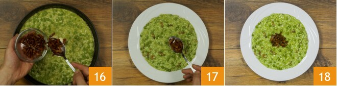 Adicione também 2/3 do bacon frito 16 e misture. Sirva colocando sobre a superfície de cada prato uma colherada de bacon 17. Aqui está pronto o risoto com bacon e creme de ervilhas.