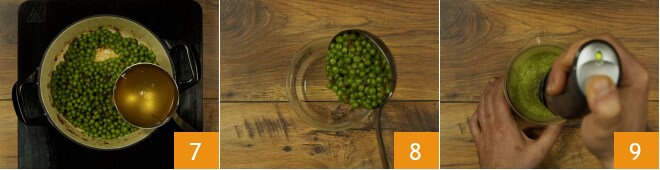 Molhe com uma concha de caldo 7 e ajuste o sal, deixando cozinhar por cerca de 5 minutos. Transfira tudo para o copo de um mixer de imersão 8 e obtenha um purê liso 9.