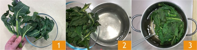Para preparar o risoto de borragem com lulas, primeiro limpe a borragem e separe as folhas dos caules 1. Mergulhe as folhas em uma panela com água fervente 2 e escalde por alguns minutos, depois escorra e reserve a água do cozimento 3, que será usada para cozinhar o arroz.