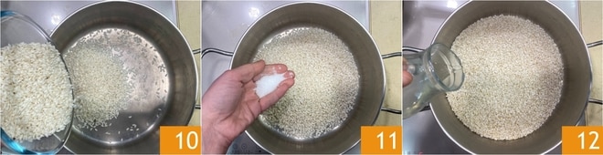 Agora comece a cozinhar o risoto: toste o arroz em uma panela bem quente 10 com um pouco de sal 11, depois deglace com o vinho branco 12.