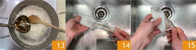 Quando o álcool tiver evaporado, adicione uma concha da água de cozimento da borragem e espere que o líquido seja absorvido antes de adicionar a próxima 13. Proceda desta forma para cozinhar o arroz, enquanto cuida das lulas: remova as vísceras e o osso, lavando bem sob água corrente 14, depois retire a pele 15.