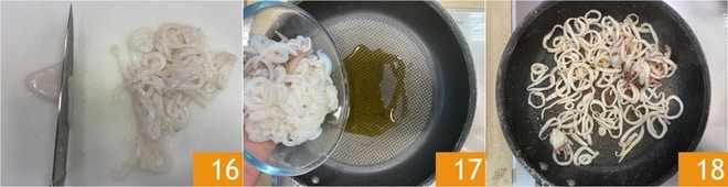 Corte as lulas em fatias finas 16, depois coloque em uma frigideira com um fio de azeite 17 e salteie em fogo alto por alguns minutos 18.