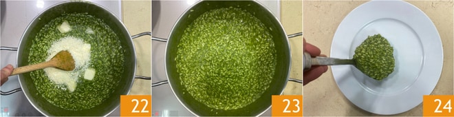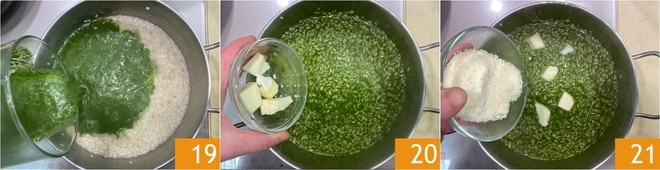 Enquanto isso, o arroz estará quase cozido, então adicione o creme de borragem 19 e misture tudo. Com o fogo desligado, incorpore a manteiga 20 e o Parmigiano Reggiano DOP ralado 21.