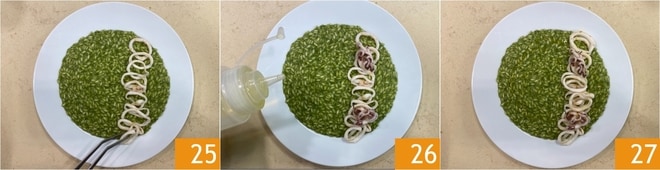 Decore os pratos com as lulas 25 e um fio de azeite 26. O risoto de borragem com lulas está pronto para ser servido 27!