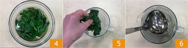 Transfira a borragem para uma tigela com água fria para interromper o cozimento e manter a cor 4. Escorra as folhas e transfira para um liquidificador 5 junto com uma concha de sua água de cozimento 6.