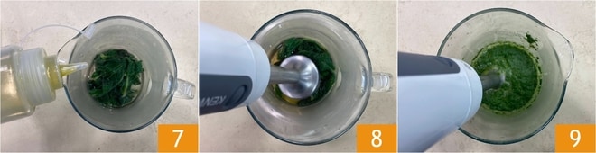 Adicione um fio de azeite 7 e bata com um mixer de imersão 8 até obter um creme liso e homogêneo 9.