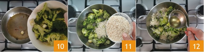 Adicione o brócolis cozido e bem escorrido 10. Deixe refogar por cerca de dez minutos. Adicione o arroz 11 e toste-o por alguns minutos, depois adicione o caldo de legumes uma concha de cada vez 12 para cozinhar o arroz, mexendo frequentemente.