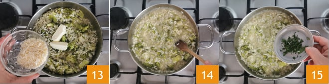 Após cerca de 20 minutos, o arroz estará cozido, desligue o fogo e misture com a manteiga e o queijo ralado 13. Mexa para incorporar 14, depois tempere com a salsinha 15.