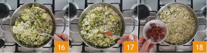 Salgue, apimente 16 e aromatize com noz-moscada 17. Por fim, incorpore os tomates secos escorridos do óleo e picados 18.