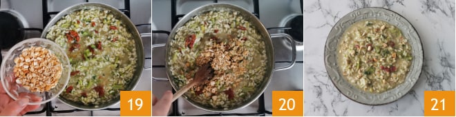 Adicione a maior parte das castanhas de caju torradas 19, reserve um punhado para a decoração final. Misture mais uma última vez 20 e sirva o risoto com brócolis e castanhas de caju polvilhando sobre cada prato as castanhas de caju torradas restantes 21.