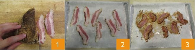Para preparar o risoto com couves-flores coloridas, stracciatella e guanciale, comece removendo a pele do guanciale, depois fatie-o finamente 1 e disponha as fatias em uma assadeira com papel manteiga 2 e asse no forno, já aquecido a 180°, em modo ventilado, por cerca de 8 minutos 3.