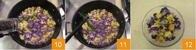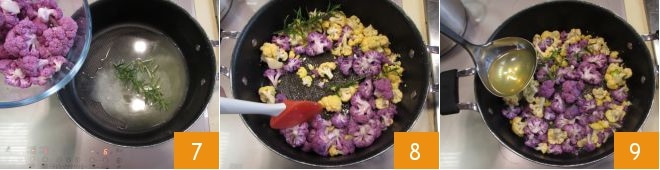 Enxágue-os sob água corrente fria e passe para o cozimento. Em uma caçarola, derreta 25 g de manteiga e perfume com um ramo de alecrim. Em seguida, na base quente, coloque os buquês da couve-flor roxa e amarela 7. Cozinhe por cerca de dez minutos, mexendo delicadamente de vez em quando 8 e ajudando-se com algumas conchas do caldo 9.