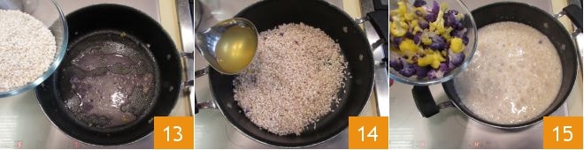 No mesmo recipiente, coloque o arroz 13 e deixe-o tostar por alguns minutos, mexendo continuamente. Quando estiver pronto, regue com o caldo quente 14 e cozinhe mexendo de vez em quando; ajuste o sal e a pimenta a gosto. A dois minutos do final do cozimento, adicione os buquês 15