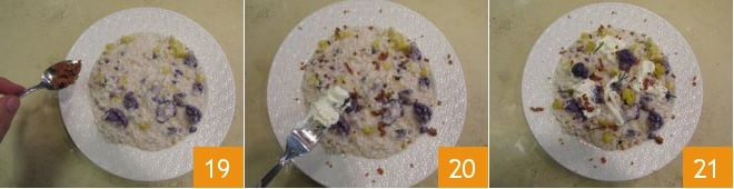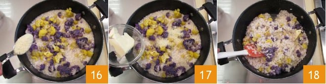 e finalize mexendo bem. Em seguida, desligue o fogo e acrescente o queijo ralado 16 e o restante da manteiga 17. Mexa bem e prossiga com a apresentação 18.