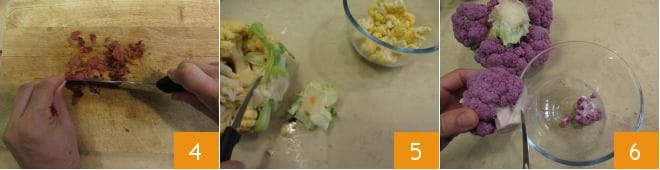 Quando estiver pronto, pique o guanciale finamente com uma faca para obter as migalhas 4. Passe para as couves-flores. Retire imediatamente os talos 5 e mergulhe-os em uma panela com bastante água, a cenoura, a cebola e o sal grosso e deixe ferver por meia hora, obtendo assim o caldo de legumes que você usará para cozinhar o arroz. Enquanto o caldo cozinha, limpe as duas couves-flores retirando os buquês 6.