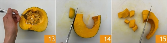 Enquanto isso, limpe a abóbora: retire as sementes 13, tire a casca 14 e corte em cubos 15.