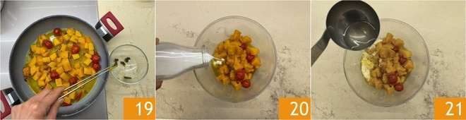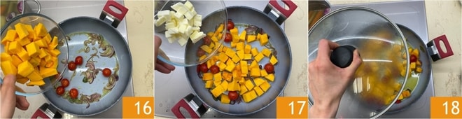 Adicione a abóbora 16 e a manteiga 17, tempere com sal e cubra com a tampa 18. Cozinhe por cerca de 20 minutos em fogo baixo.