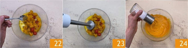 Tempere com o curry 22 e bata com um mixer de imersão 23, depois ajuste o sal 24.