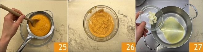 Coe o creme através de uma peneira 25 para deixá-lo mais liso 26; se preferir, pode omitir esta etapa. Prepare o arroz: em uma panela, derreta a manteiga e o óleo 27.