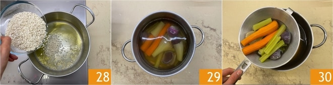 Coloque o arroz, adicione sal e deixe tostar até que os grãos estejam bem quentes 28. Enquanto isso, recupere o caldo que você preparou 29 e coe 30.