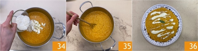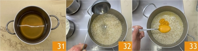 O caldo está pronto 31, adicione-o aos poucos ao arroz para cozinhá-lo 32. Após cerca de 6-7 minutos, incorpore também o creme de abóbora 33 e termine o cozimento.