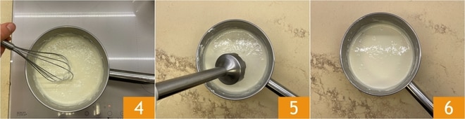 Leve à ebulição, mexendo com um batedor 4. Quando o queijo estiver derretido, retire a panela do fogo e bata com um mixer de imersão 5 para obter um creme liso e aveludado 6.