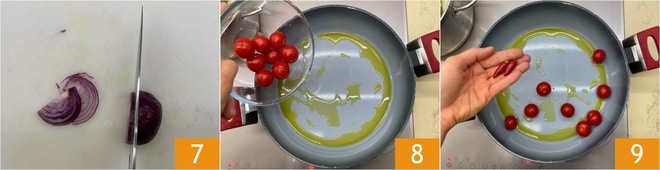 Passe para o creme de abóbora: descasque e fatie meia cebola 7, depois em uma frigideira, coloque um fio de óleo, os tomatinhos 8 e os pimentões inteiros 9.
