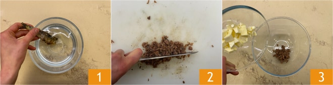 Para preparar o risoto com radicchio, manteiga de anchovas e pão aromático, comece pelo creme de anchovas: após dessalgar em água por algumas horas, conforme a necessidade 1, pique finamente com uma faca 2. Transfira as anchovas picadas para uma tigela e adicione a manteiga amolecida 3.
